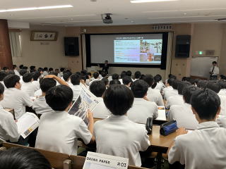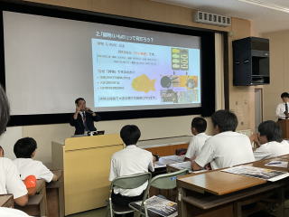 9月17日(水)に大和重工の宮迫雄也氏をお迎えし、講演会を行っていただきました。講演では「広島におけるものづくりの歴史や魅力」に加え、自分の核となる趣味や特技を持つことの大切さについてお話しいただきました。生徒からは「好きなことを見つけて極めたい」、「将来に役立てたい」といった感想が多く寄せられ、ものづくりを学ぶ意欲や将来を考えるきっかけとなりました。今回の講演を通じて、生徒たちは地域産業のすばらしさを知るとともに、進路や人生を考えるうえで貴重な学びを得ることができました。